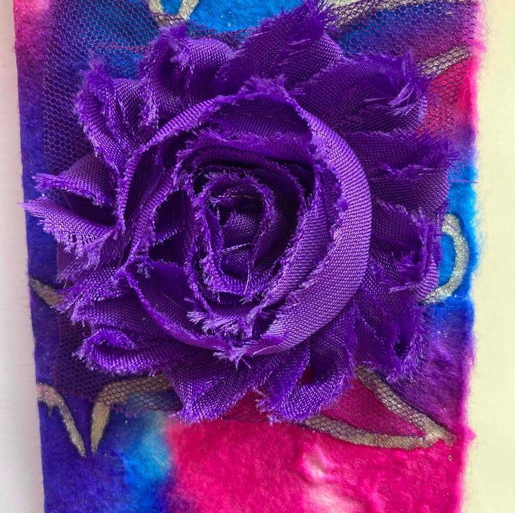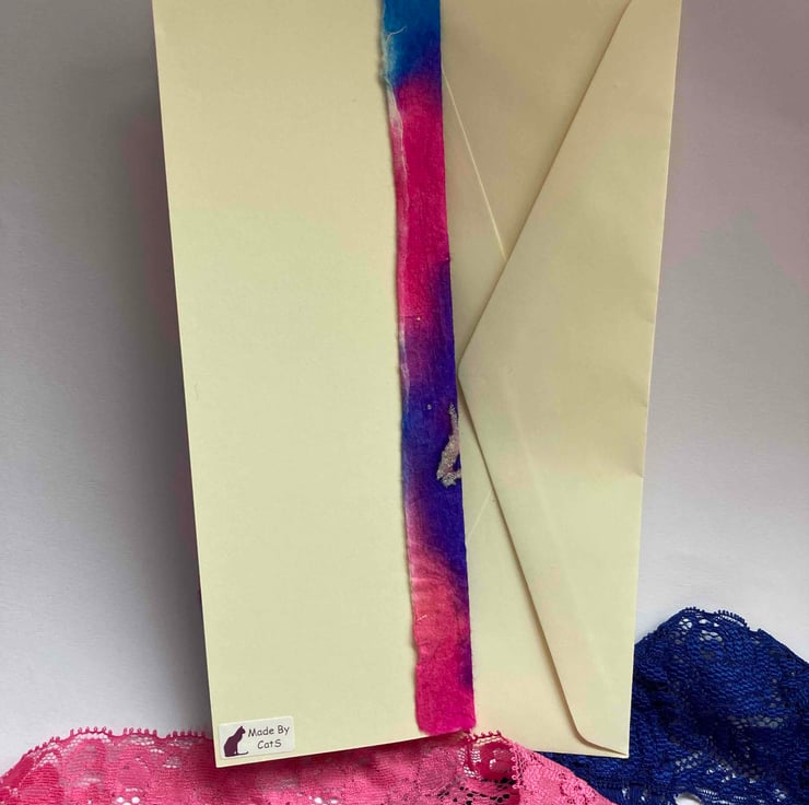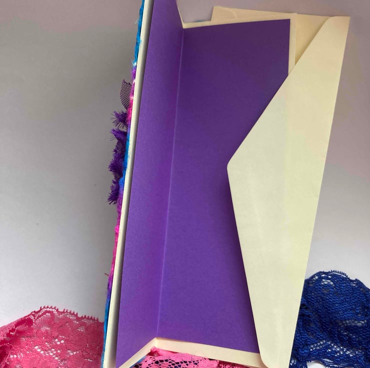 This is a handmade card which is blank inside for your own message. The card and envelope are ivory and the insert is purple.
