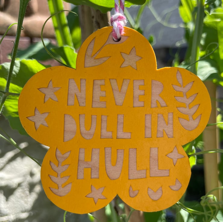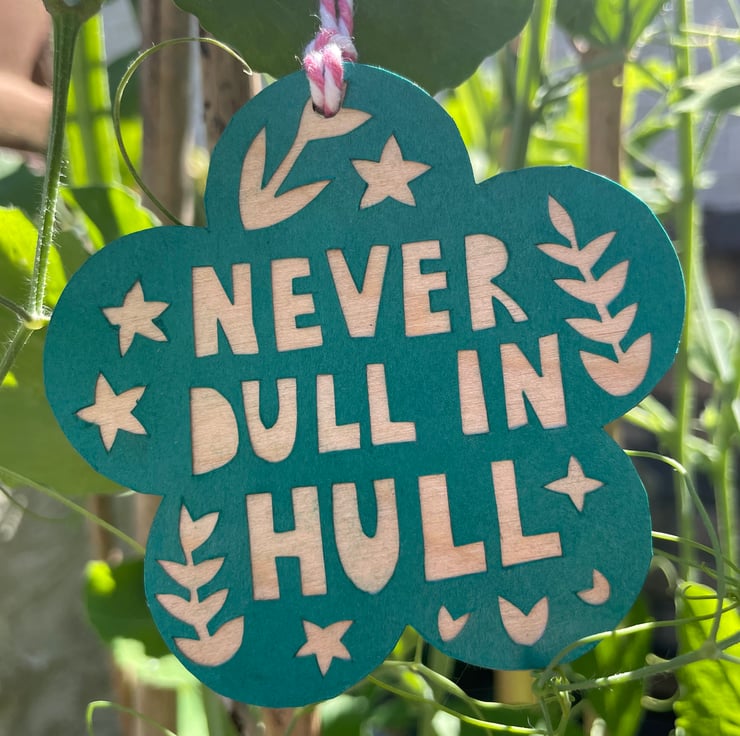 It’s never dull in Hull! A hanging decoration with a floral pattern and a phrase often used in our wonderful city. This could also be used as a gift tag for a special present. Or maybe to send a message to a friend who has left Hull and misses it?