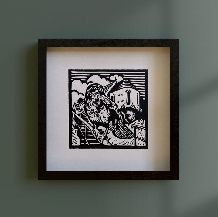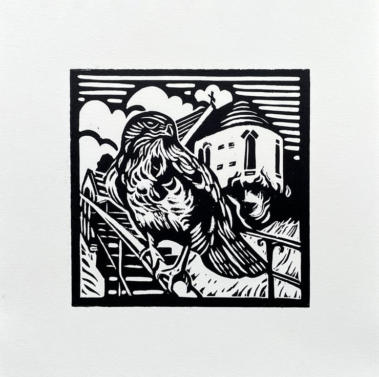 'Burton Joyce Buzzard' is an original linocut. It has been printed by hand on quality ivory coloured paper using black printing ink.