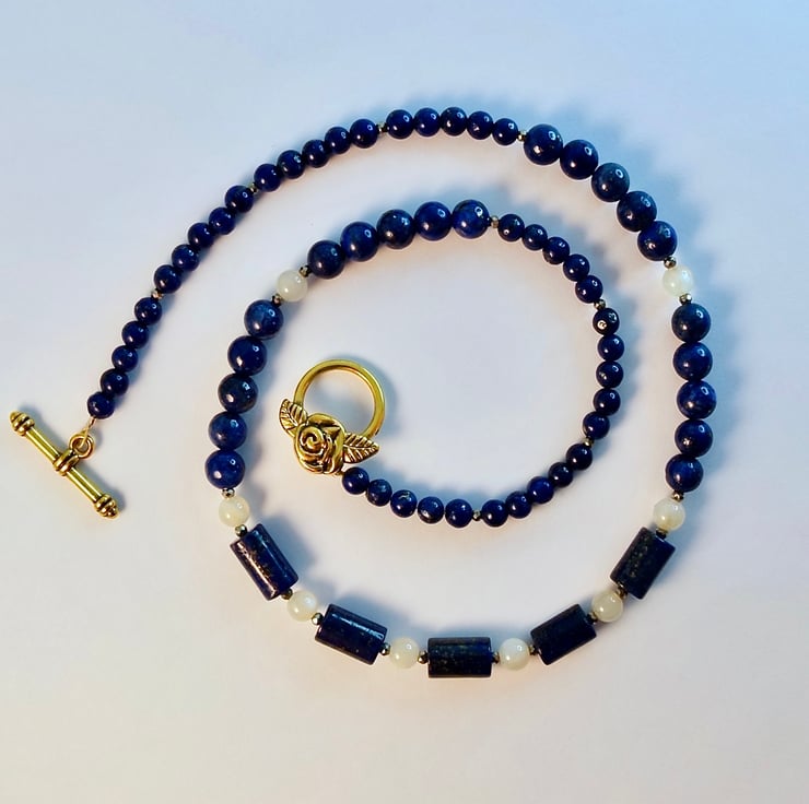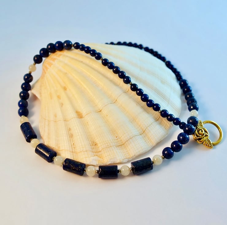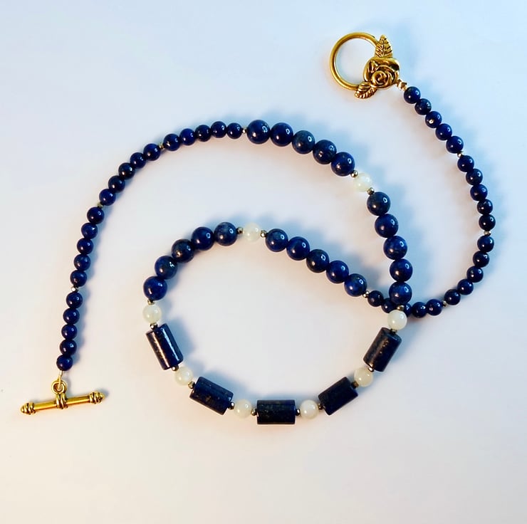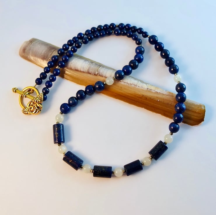 The necklace then graduates from 6mm to 4mm round Lapis Lazuli beads, further embellished with glittery Pyrite and an extra pair of Moonstone beads.