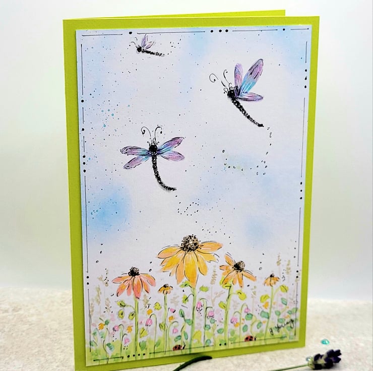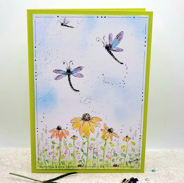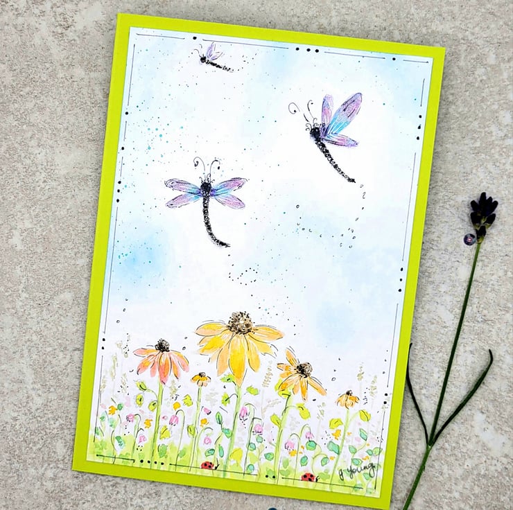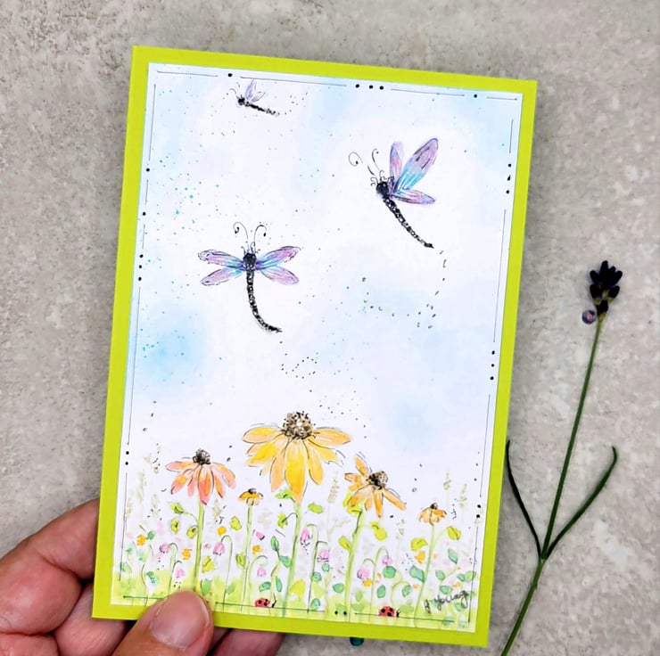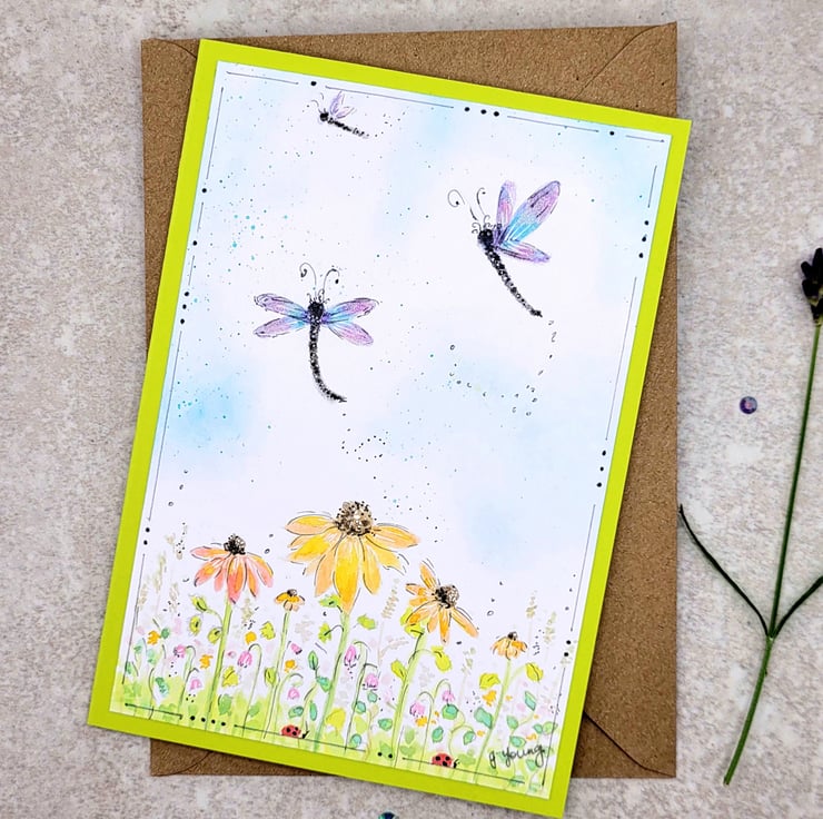 A dragonfly blank handpainted card, for all occasions. Created to relay a summer day in the garden and hopefully a lovely burst of sunshine!. An original handpainted design in a whimsical doodle style, with yellow cone flowers, inspired by my own garden plants. The card is 10.5 x 15 cms and has been designed and individually handpainted in my craftroom.