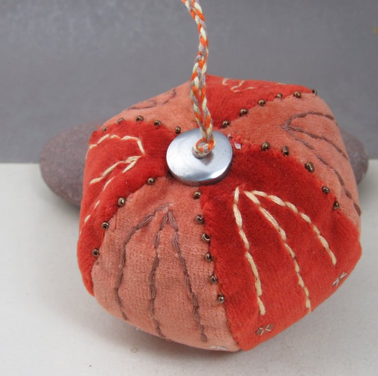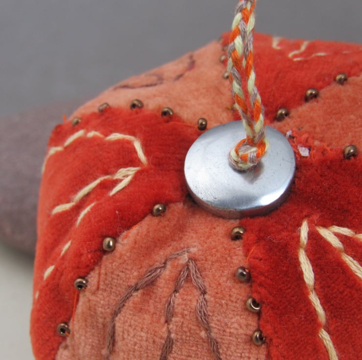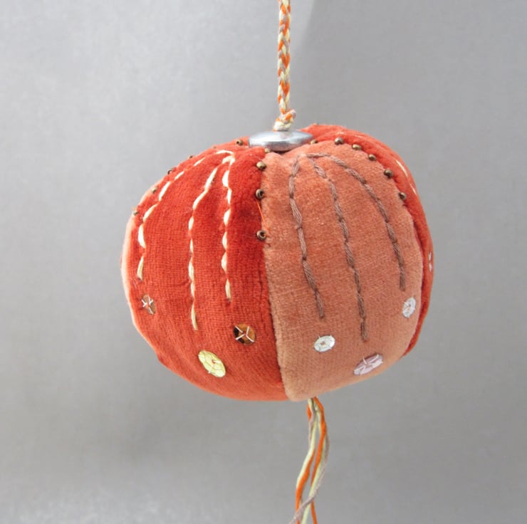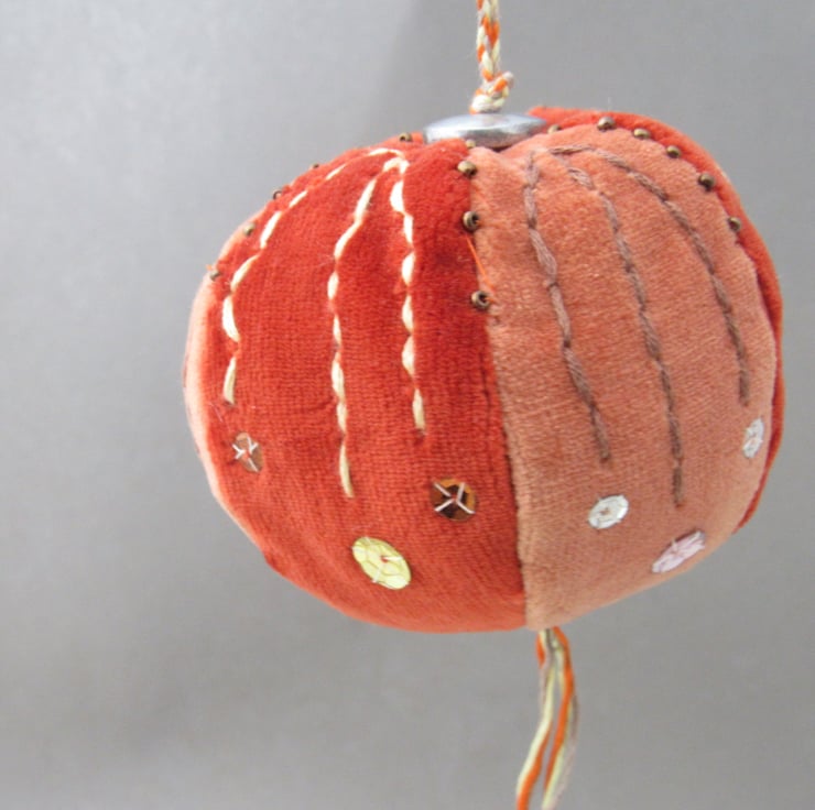 Stitched from reclaimed velvet in 2 shades of orange, this large bauble is finished with hand embroidery, small glass beads, sequins and a braided loop for hanging.