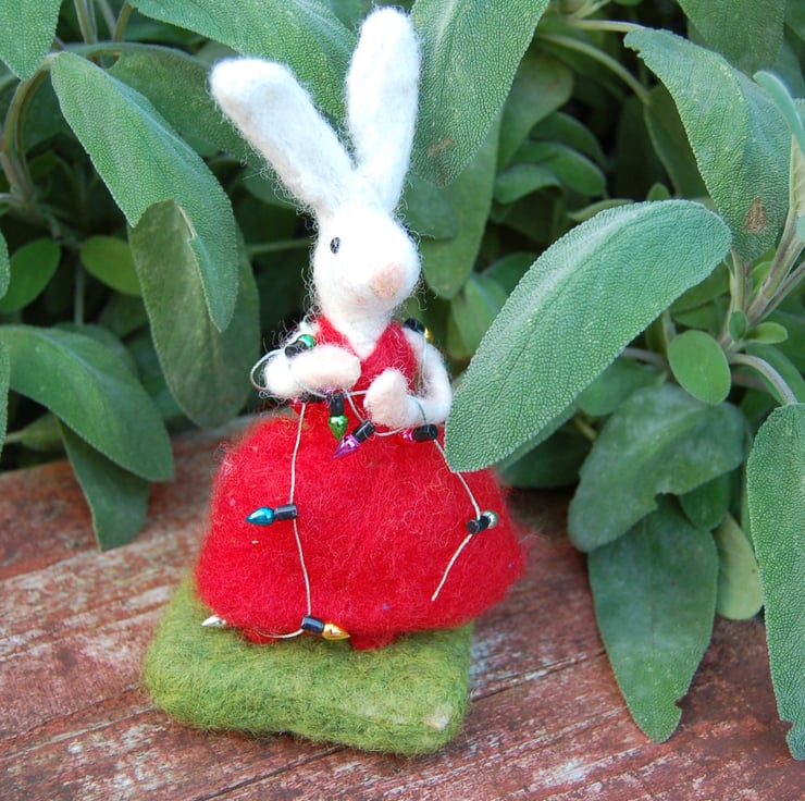 A wool white rabbit wearing a red wool dress and holding Christmas Lights. She is dressing the tree and having a right old time untangling the lgihts!