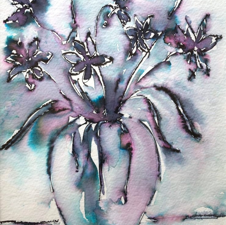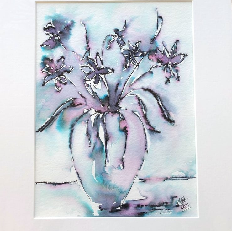 Painting of a bowl of blue and purple daffodils. Painted on acid free paper using blue, black & purple inks. The card mount is an ivory colour and is acid free also.