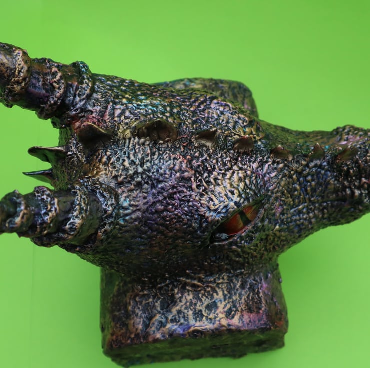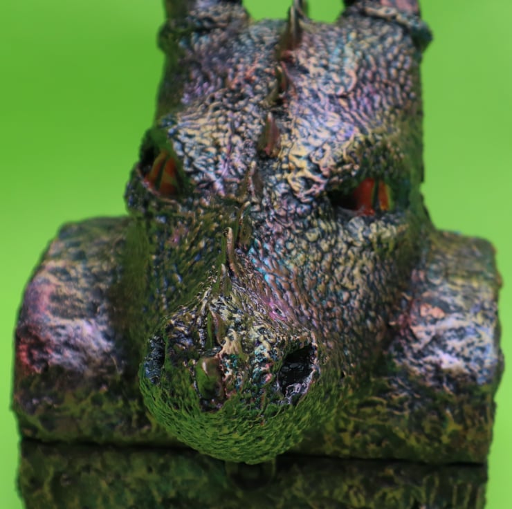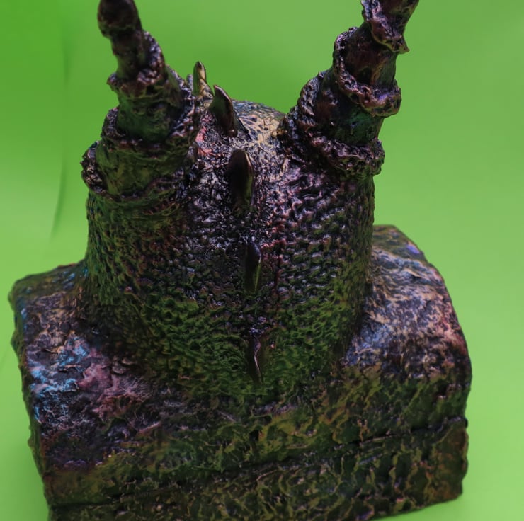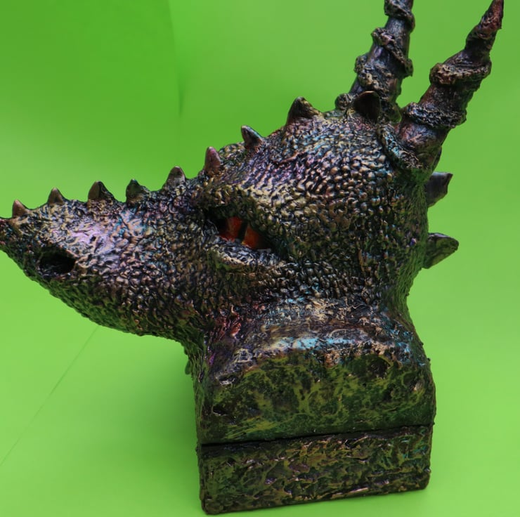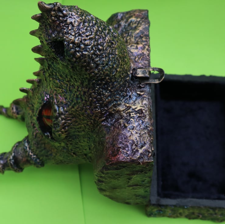 This large and unusual 3D dragon chest, lined with plush velvet fabric, is a unique handcrafted piece. It measures approximately 14 cm x 9.5 cm (5.5 inches x 3.5 inches) with a height of 8 cm (3.5 inches). The dragon itself measures around 7.5 cm x 19 cm, and together with the box, it reaches a total dimension of 22 cm (8.5 inches).