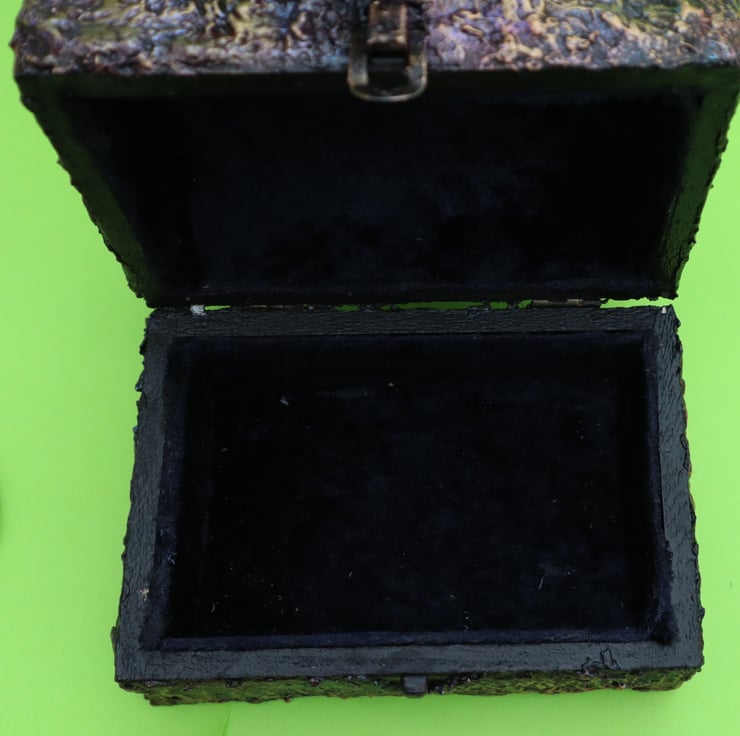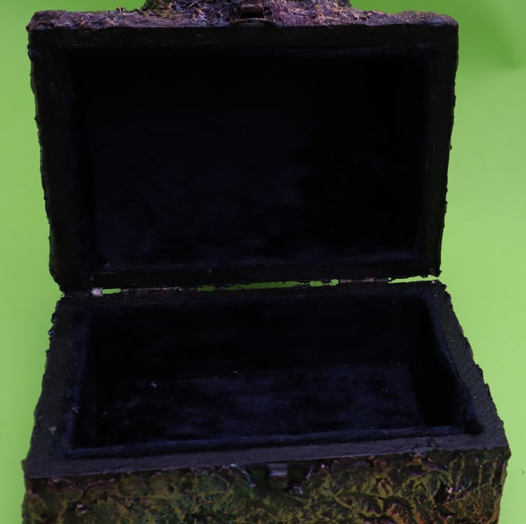 The chest is hand-sculpted in air-drying clay and hand-painted using Powertex and dry brushed with acrylic paints in shades of green, black, red, and gold. This versatile box can be used for various purposes, such as storing dice, trinkets, jewelry, money, deep dark secrets, or precious dragon eggs. It's perfect for DnD accessories, making it a great wedding memory box or a DnD dice box.