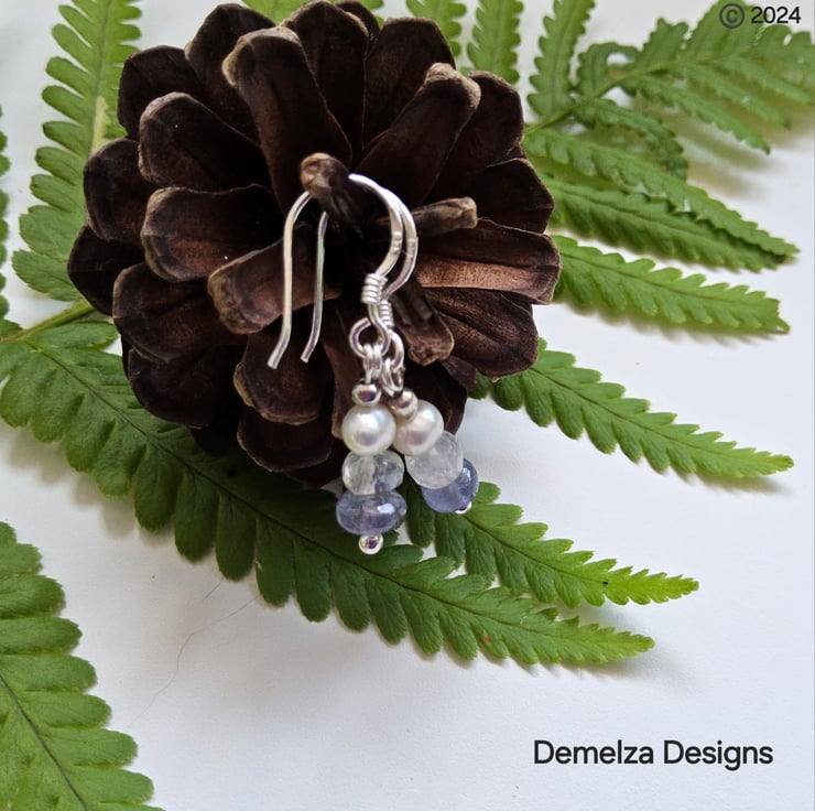 A beautiful dainty pair of drop style sterling silver earrings made in Cornwall hand crafted from quality smooth polished Tanzanite rondelles and free hand faceted moonstone rondelle cut gemstones. To compliment them high grade micro white freshwater culture pearl sit above them. Tanzanite gemstones are rare and difficult to obtain within the trade in good quality. These tanzanite rondelles have strong colour for their tiny size. Tanzanite is mainly valued purely on its colour; the deeper voilet they are the more expensive they became. Gem quality in 18k and platinum jewellery should also display other colours and the they are refered to as Bi colour and tricoic.