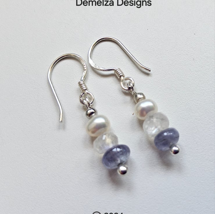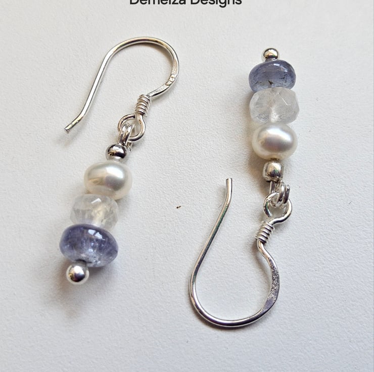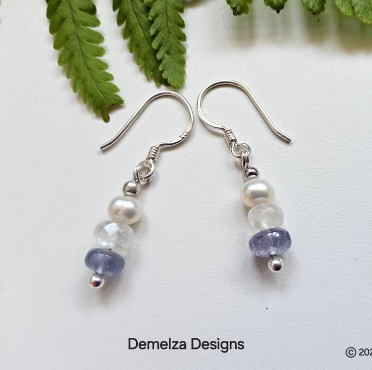 Tiny Dainty Tanzanite, Moonstone & Freshwater Pearl Sterling Silver Earrings