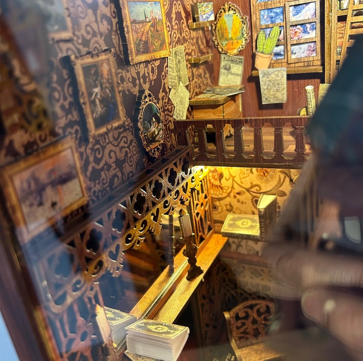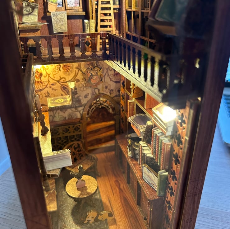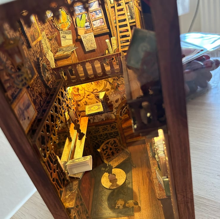 This is a ready made version of the Bookstore Book Nook, we do all the hardwork for you. We will put the book nook together, glue everything in place, and do all the fiddly things. We then ship it out ready for you to give as a present obviously this can take us a few days to do. If you would like a customised book or note put on the book nook please let us know.