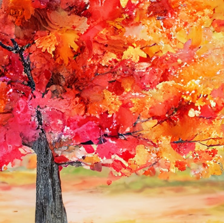 This stunning painting of a vibrant autumn tree captures the essence of fall’s beauty and charm. The artwork features a tree in full autumn splendor, with leaves in vivid shades of red, orange, and yellow. The rich colors and detailed brushstrokes bring the tree to life, creating a warm and inviting atmosphere.