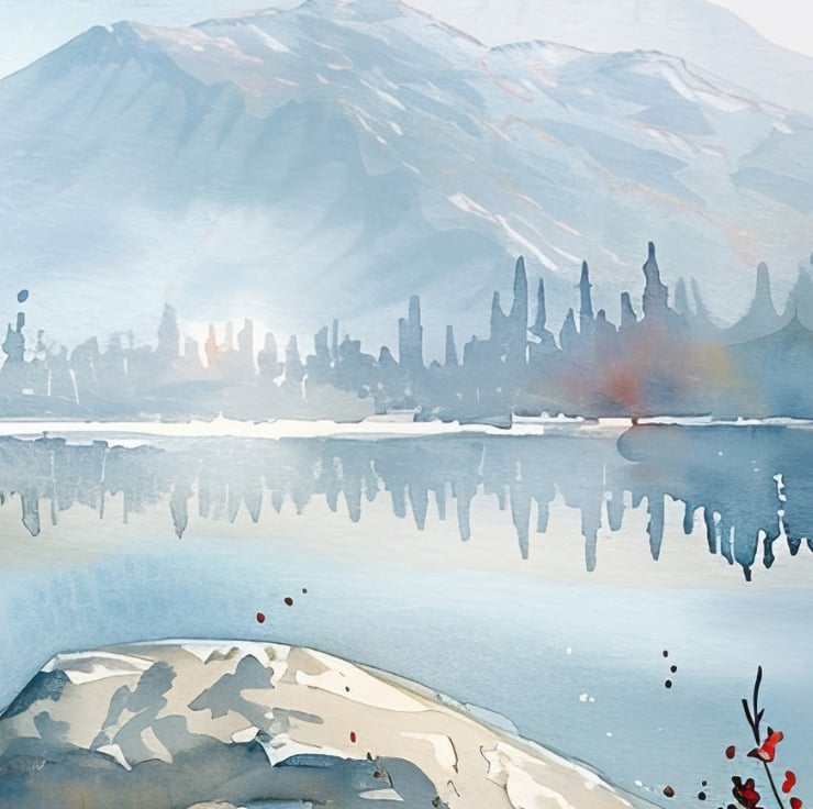 The artist masterfully uses a gentle color palette to highlight the natural beauty of the scene. Furthermore, the interplay of light and shadow adds depth, making the mountains and trees appear three-dimensional and lifelike. The serene water reflects the landscape perfectly, besides enhancing the sense of tranquility.