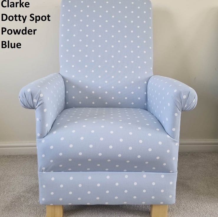 This is a handcrafted, sturdy adult sized armchair, which has been made by myself, a professional upholsterer with over 32 years experience, using Clarke & Clarke Dotty Spot Powder Blue fabric