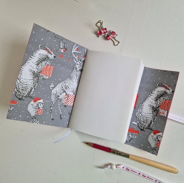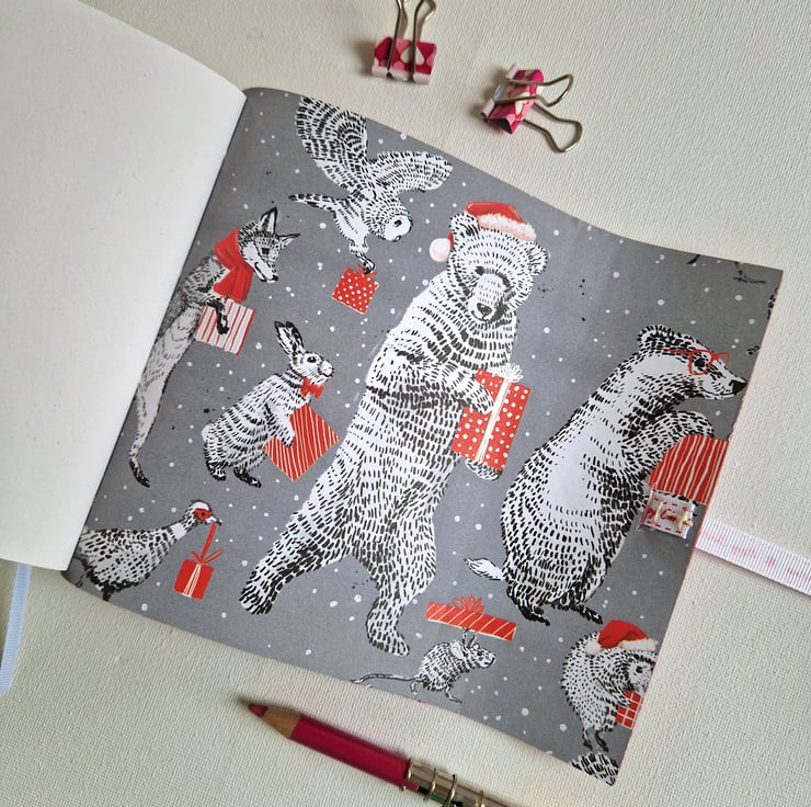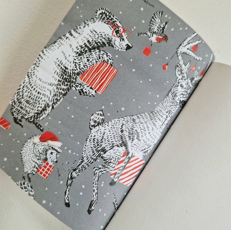 A6 size, approximately 15.5cm x 11.5cm x 2.5cm, the perfect size to keep under the tree for when needed. The paper lining the covers is beautiful with a collection of Woodland animals all holding precious Christmas gifts, Fox, Rabbit, Robin, Bear, badger etc. Closed with a white and red Happy Christmas ribbon. The Journal lies completely flat when in use and has a Ribbon Page Marker.