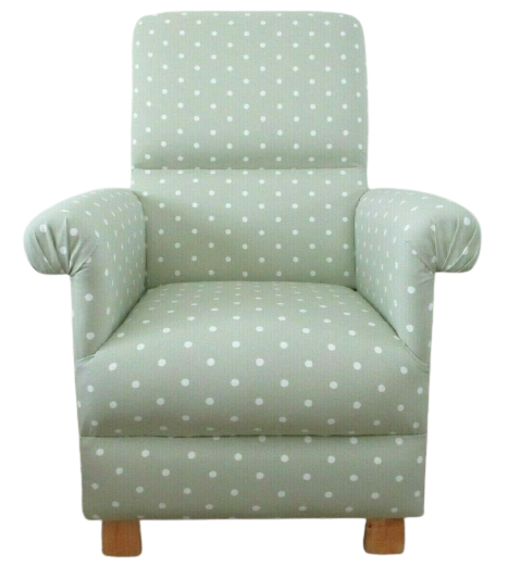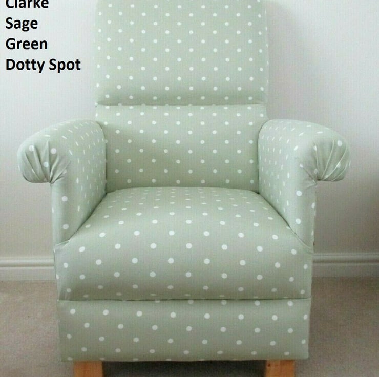This is a handcrafted, sturdy adult sized armchair, which has been made by myself, a professional upholsterer with over 32 years experience, using Clarke & Clarke Dotty Spot Sage Green fabric