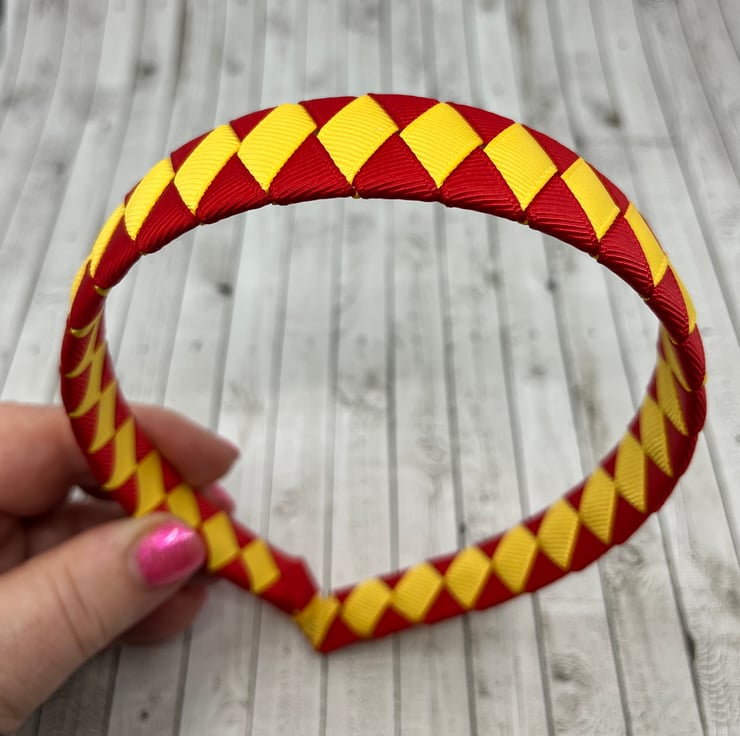 Our Diamond pleated hairbands are handmade here in our little shop. They are so cute the could compliment any school Uniform with red and yellow gold in it. They are ideal for keeping those sneaky little curls from straying into your little one's eyes.