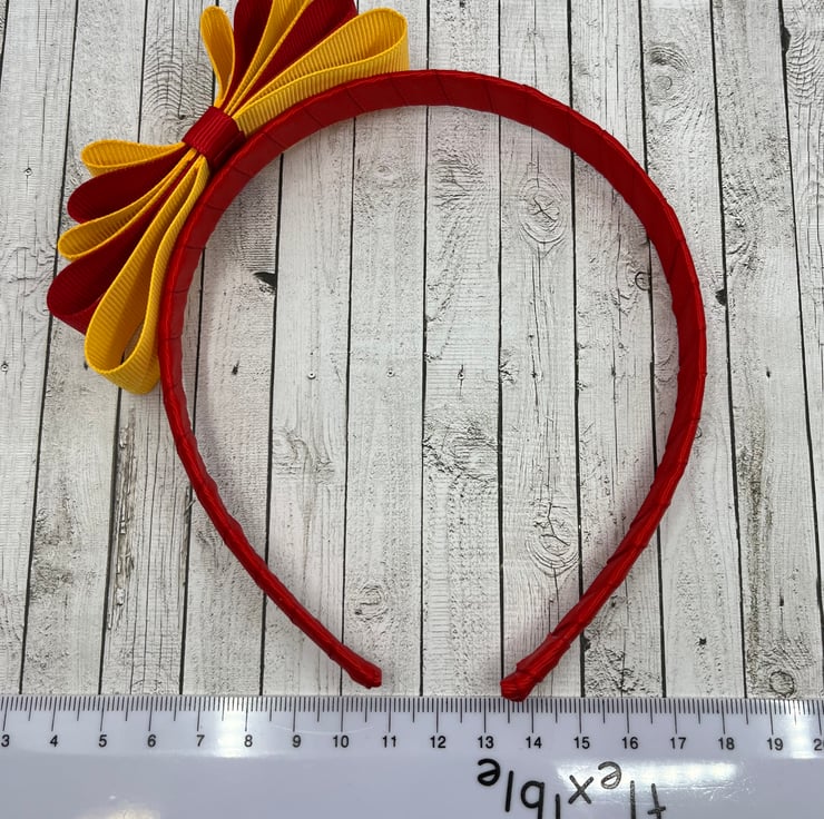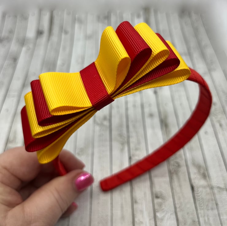 Our hairbands are handmade here in our little shop. They are so cute the could compliment any school Uniform with red and yellow gold in it. They are ideal for keeping those sneaky little curls from straying into your little one's eyes.