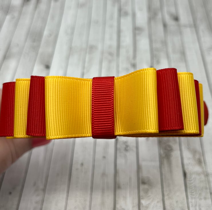 School Red and Yellow Gold Hairband with 5 Layer Two-tone Straight Bow