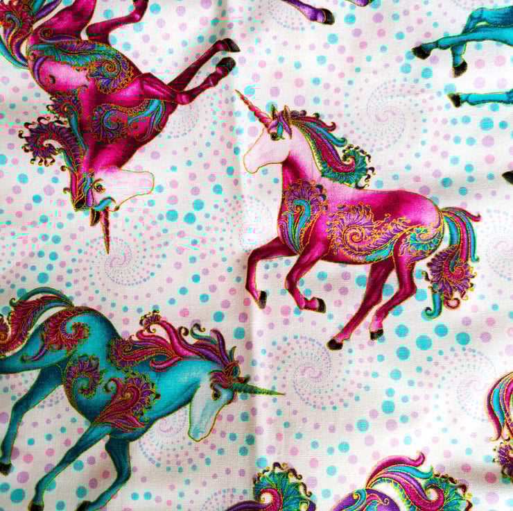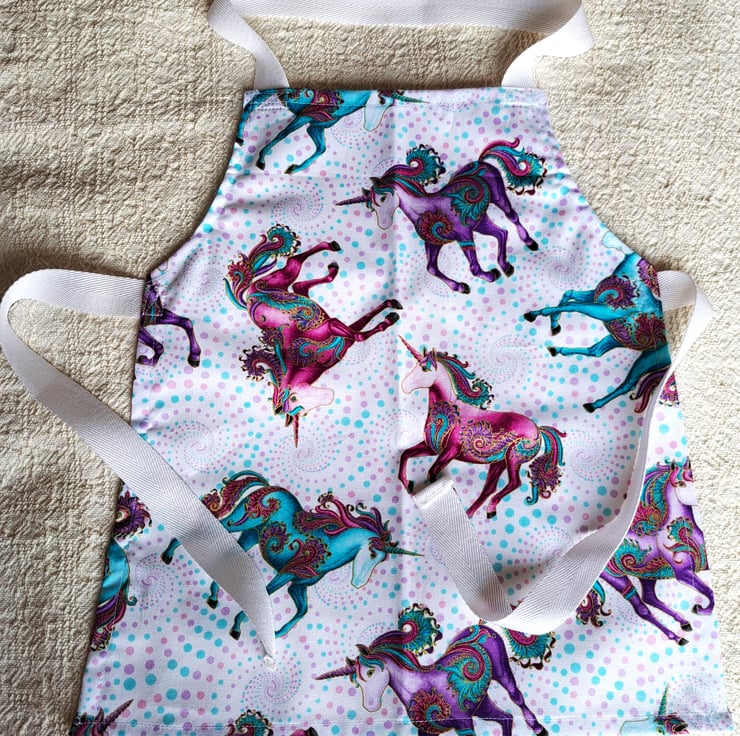 I have made aprons out of this gorgeous white cotton quilting fabric, printed with pink, purple and blue colourfully decorated unicorns outlined in sparkling gold. The unicorns, each about five inches long, prance against a background of light pink, purple and blue swirling dots. They may not appear in the same place as in the photograph.