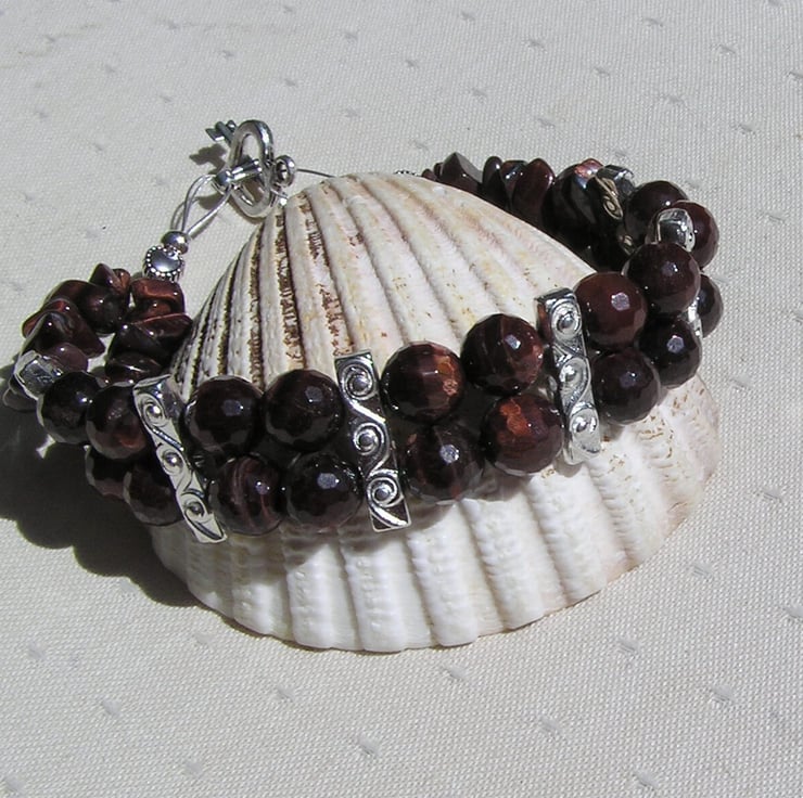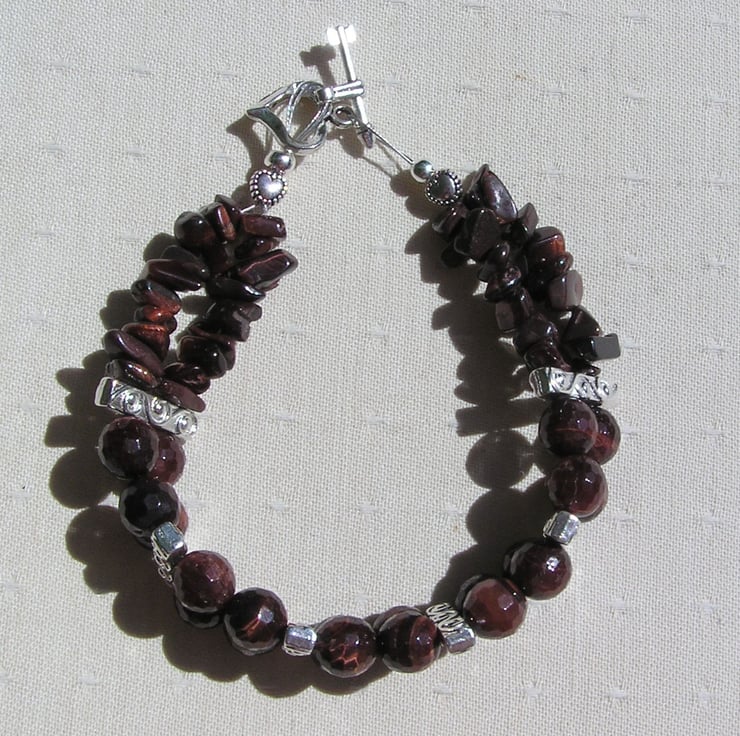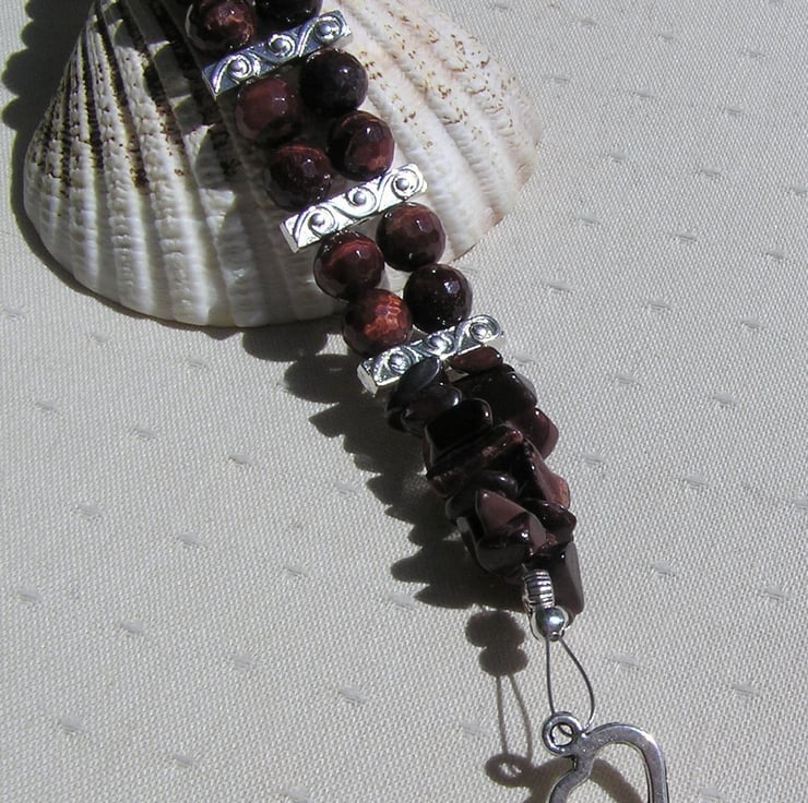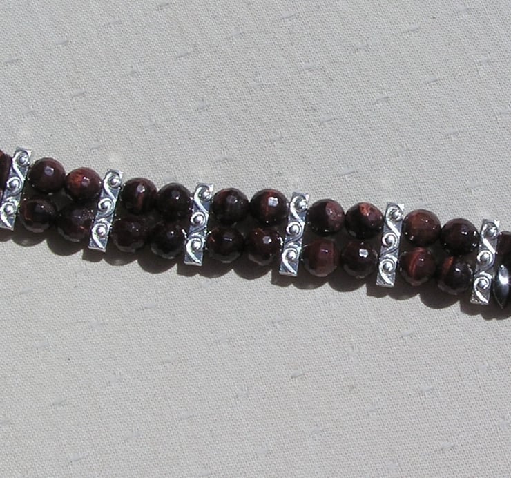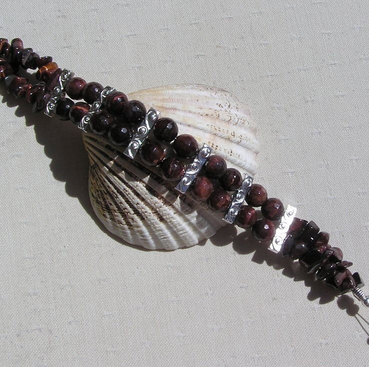 This Stunning Bracelet is made from Red Tigers Eye faceted round Beads & matching Red Tiger Eye Gem Chips… each section separated by an ornately decorated Tibetan Silver Bar Spacer with a tiny Silver Heart at each end - a Beautiful combination that will look stunning either worn casually or with something more Elegant for a Special Evening out