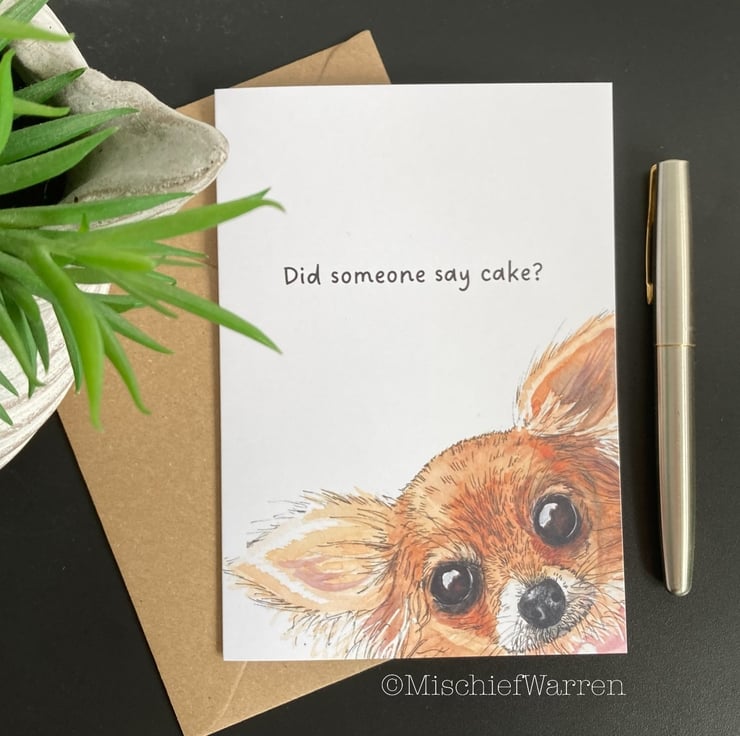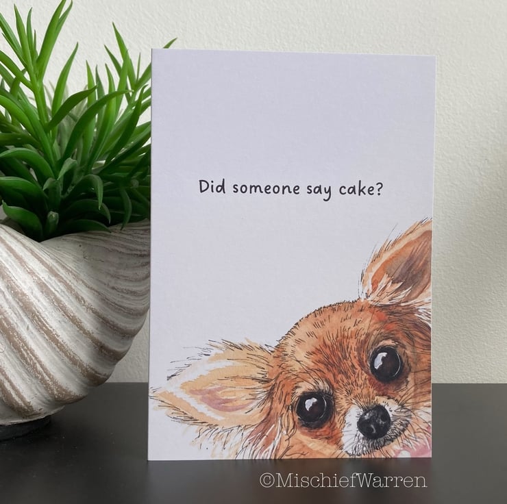 Available in 2 layouts, blank or personalised for any occasion. Be it birthday, Valentine’s day, Mothers Day, Fathers Day, Thank you, Congratulations, Wedding, Anniversary or Christmas perhaps - this Chihuahua card is sure to raise a smile. I like the sentiment “Did someone say cake?” which covers any celebration involving cake!