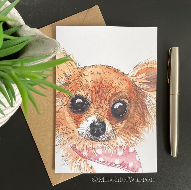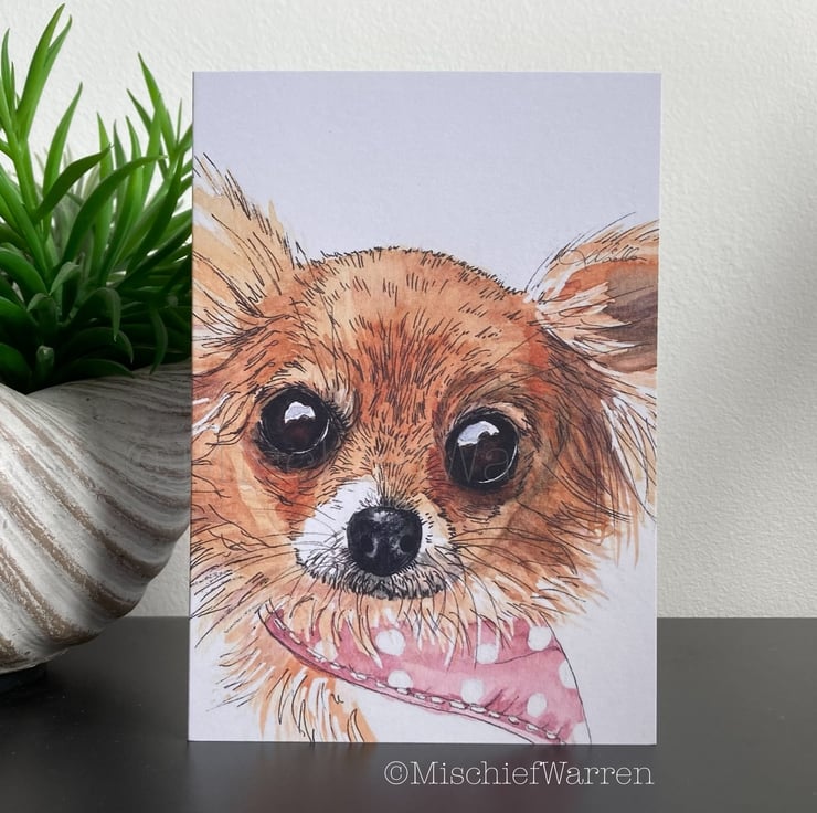 This Chihuahua card features a print of my ink and watercolour illustration of a red long haired chihuahua dog. Designed, hand drawn, hand painted and printed by me.