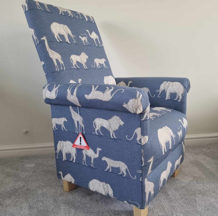 This lovely adult's armchair measures approximately 36 inches in height, by 26 inches wide and will look gorgeous in any room, and is a real accent piece of furniture. It has a wooden frame and has a fire retardant interliner, which makes it compliant with UK fire regulations. It is then upholstered entirely with this gorgeous fabric, and has solid wooden feet.
