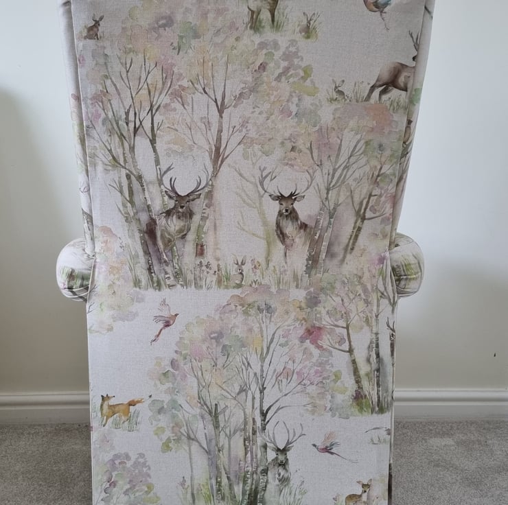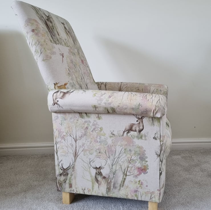 I am offering for sale this gorgeous ADULT'S chair, which has been made myself. I am a professional upholsterer with over 33 year’s experience, and have made this sturdy little chair using this timeless Voyage Enchanted Forest fabric.