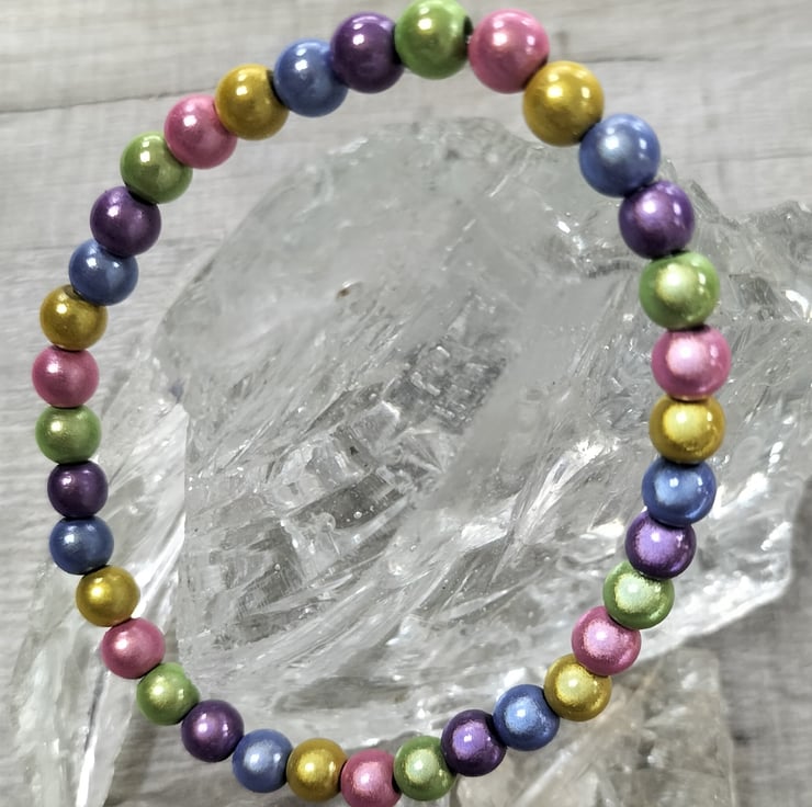 This shimmering bracelet is 7.5" long with 6mm pastel colours miracle beads thread onto elastic to make it easier to get on and off.