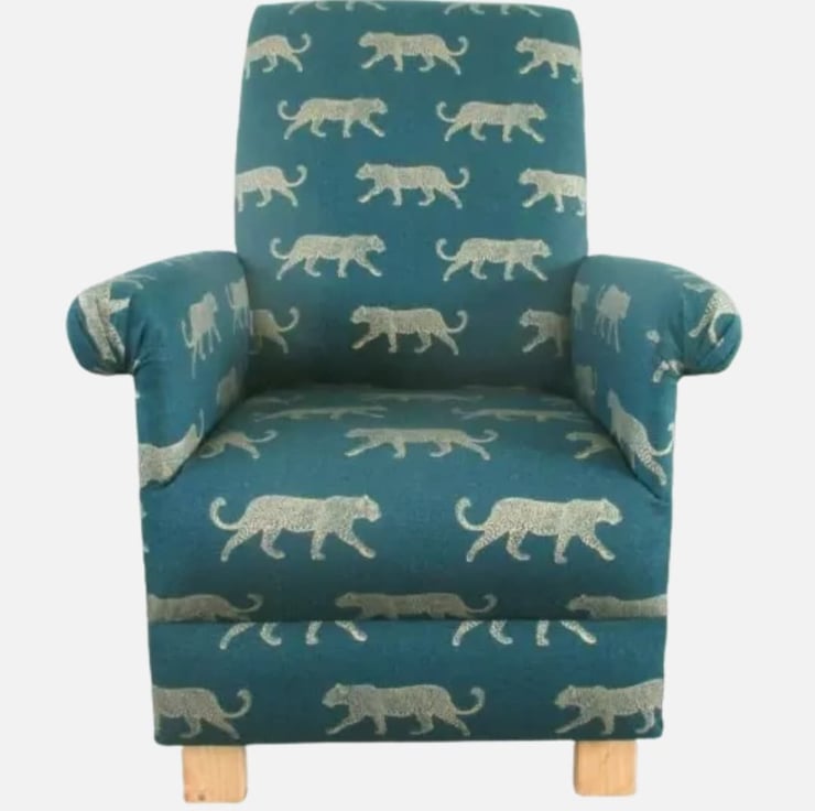 am offering for sale this gorgeous ADULT'S chair, which has been made myself. I am a professional upholsterer with over 33 year’s experience, and have made this sturdy little chair using Fryetts Leopards Teal fabric.