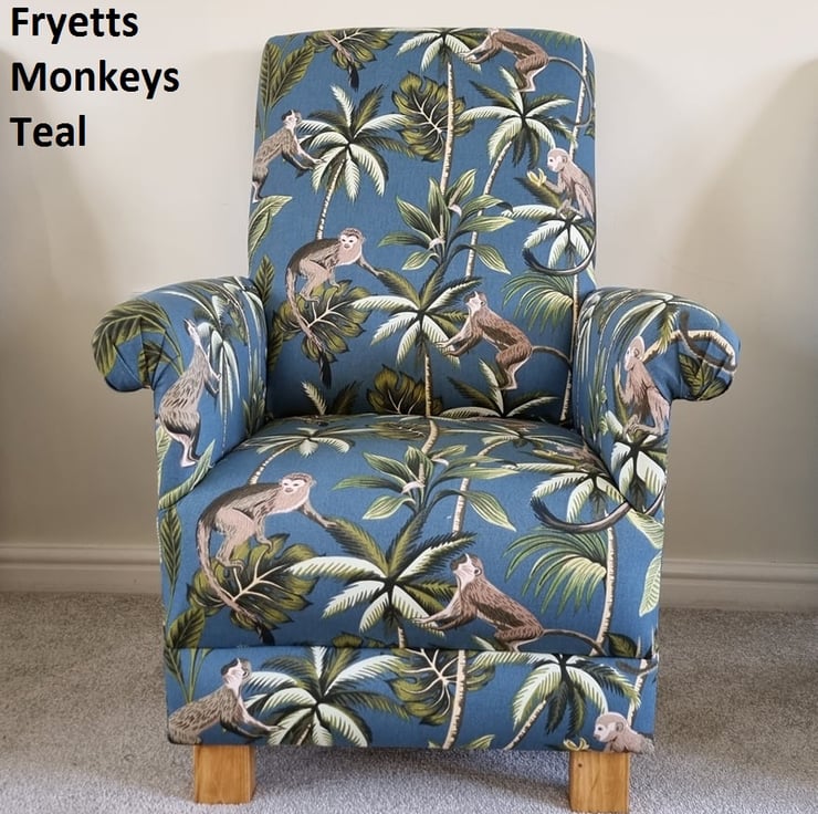 I am offering for sale, this gorgeous adult sized chair, which has been made by me, a professional upholsterer with 32 years experience, using this delightful Fryetts Monkeys Teal fabric.