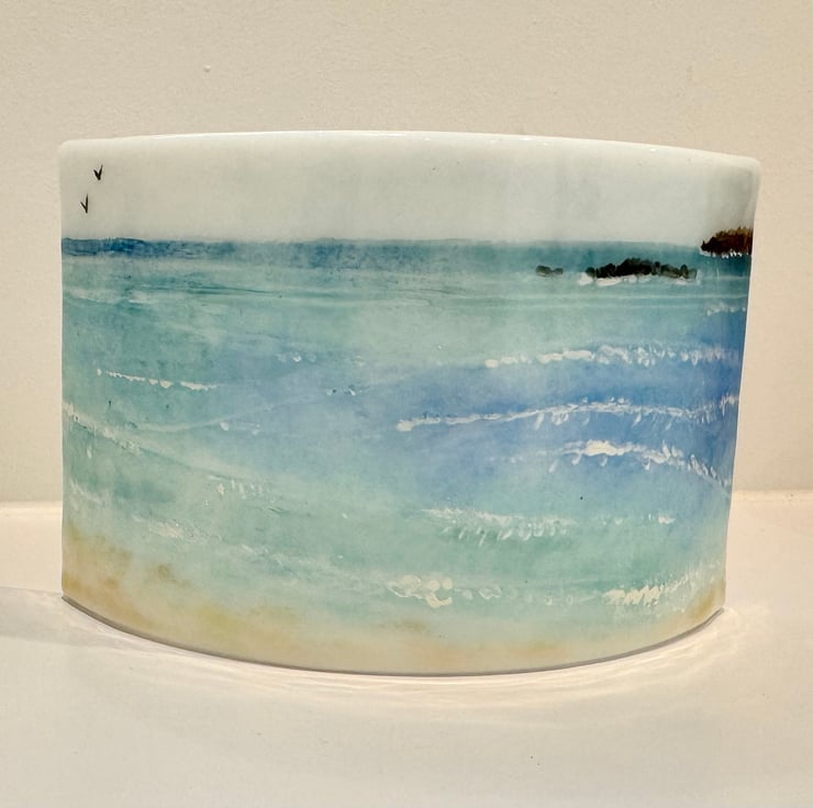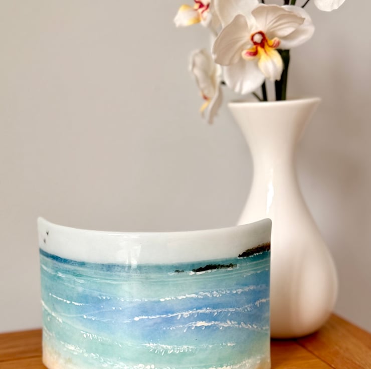 A stunning handmade and original fused glass curved stand inspired by the Dorset coast, depicting a seascape and beach scene. The piece has been fired in the kiln twice, each time taking around 18 hours. It is made with glass enamel and glass powders, layered and added to create the movement of the waves. Every piece is unique.