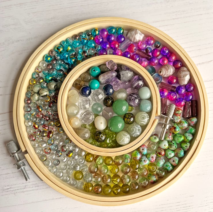 There is approx 175gms of beads.The beads inside the centre hoop are semi precious and include amethyst, carved hua jade, turquoise, green aventurine, lapis lazuli, ametrine chips, amazonite, rock crystal, peridot chips, moonstone, labradorite and yellow cracked agate.
