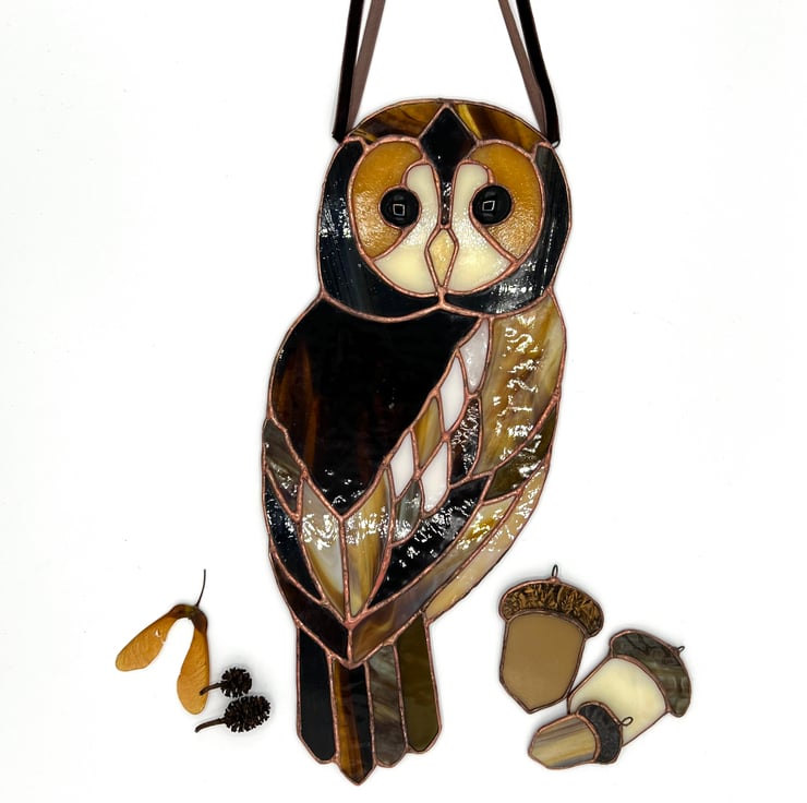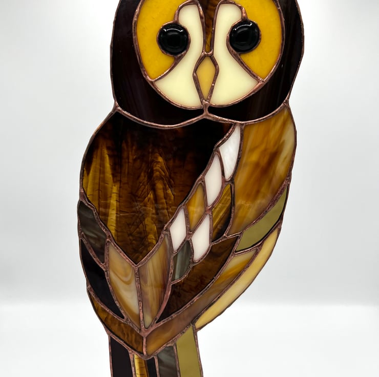 The stained glass tawny owl is perfect for nature lovers, bird lovers, and owl lovers. This art suncatcher stands out against a wall and truly glows against a window or with light behind it.