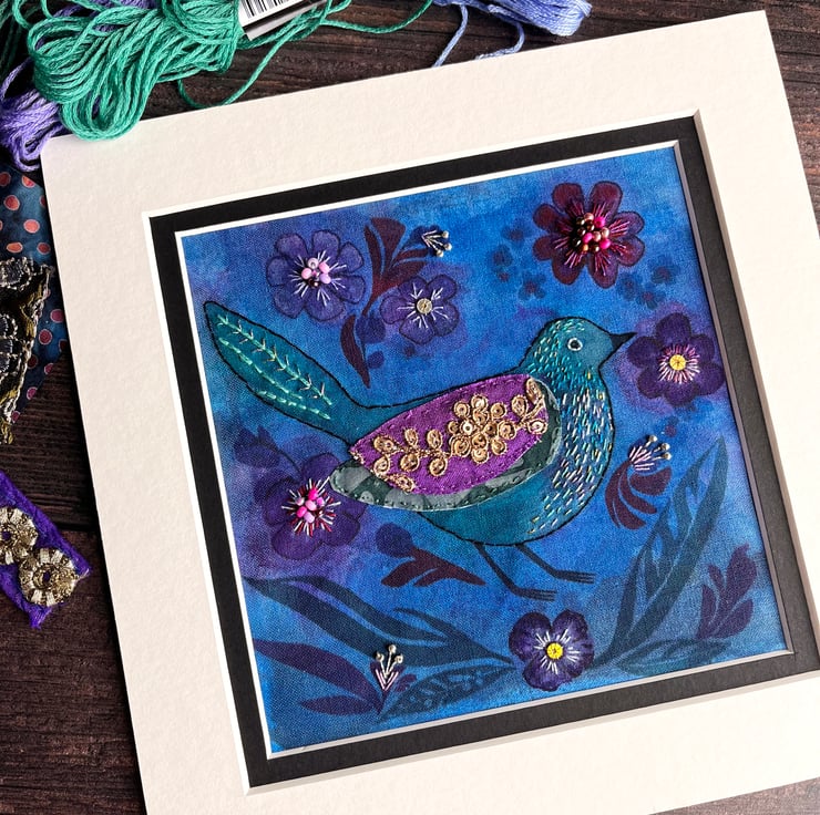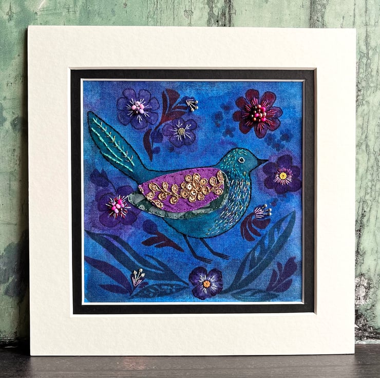 The design has been printed onto cotton fabric and I've painted it with inks to create a twilight feel. The bird's wing has been hand stitched using batik and Indian sequinned trim. I've added hand stitching to the bird, some of which is in metallic thread to add a bit of shimmer. The larger flowers have been embellished with embroidery threads, seed beads and sequins.