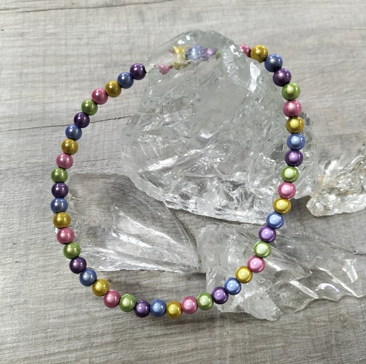 This shimmering anklet is 10.5" long with 6mm pastel miracle beads thread onto elastic to make it easier to get on and off.