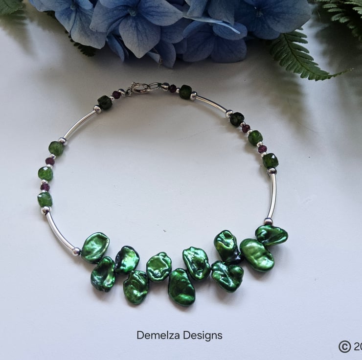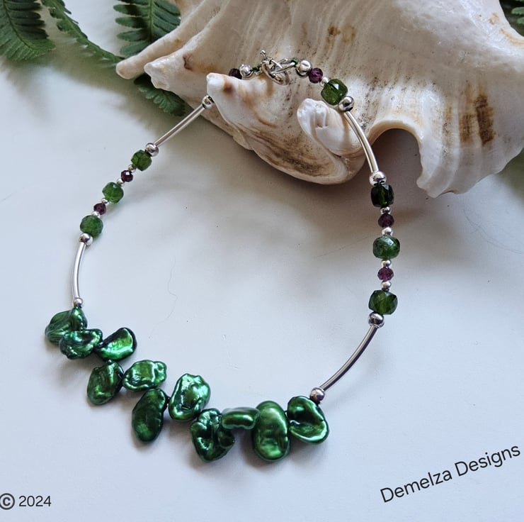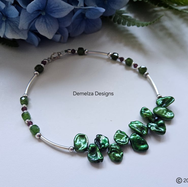 The item has been designed and hand crafted in Cornwall using green dyed keshi Pearl and hand faceted 4mm square cut Russian diopside gemstone beads. To complimented them genuine hand faceted 3mm rare rhodanite garnets add a pope of colour. Between the gemstones are 2mm sterling silver spacer beads and four strong 1.5mm diameter sterling silver tubes to give a bangle style shape.