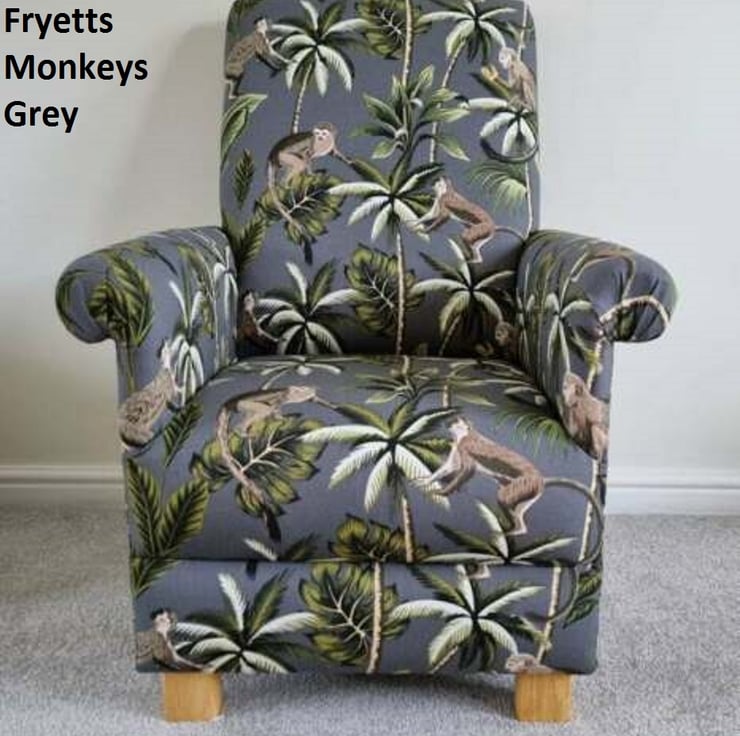 I am offering for sale this gorgeous ADULT'S chair, which has been made myself. I am a professional upholsterer with over 33 year’s experience, and have made this sturdy little chair and matching footstool, using Fryetts Monkeys Grey fabric.