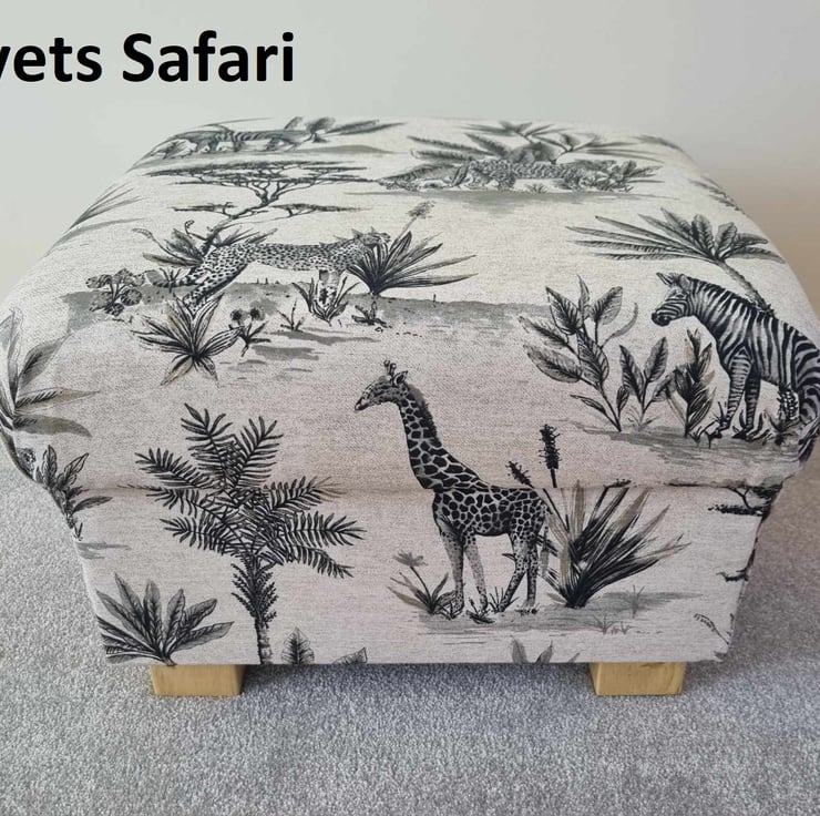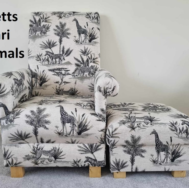 I am offering for sale this gorgeous ADULT'S chair, which has been made myself. I am a professional upholsterer with over 33 year’s experience, and have made this sturdy little chair and matching footstool, using Fryetts Safari Animals fabric.