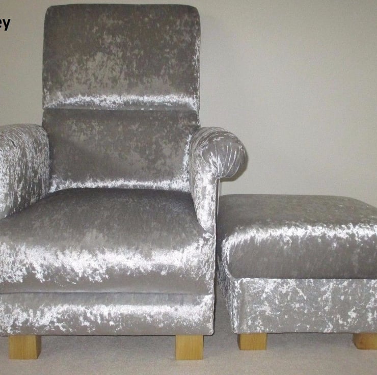 Silver Grey Velvet Chair Adult Armchair & Footstool Nursery Accent Pouffe Small