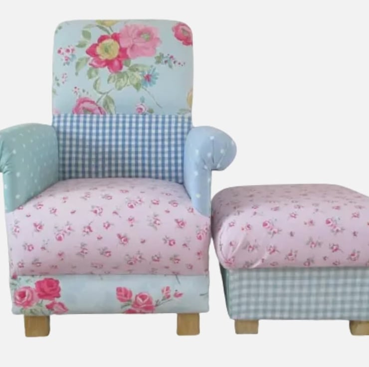 I am offering for sale this gorgeous ADULT'S chair, which has been made myself. I am a professional upholsterer with over 33 year’s experience, and have made this sturdy little chair and matching footstool, using Laura Ashley & Clarke fabrics.