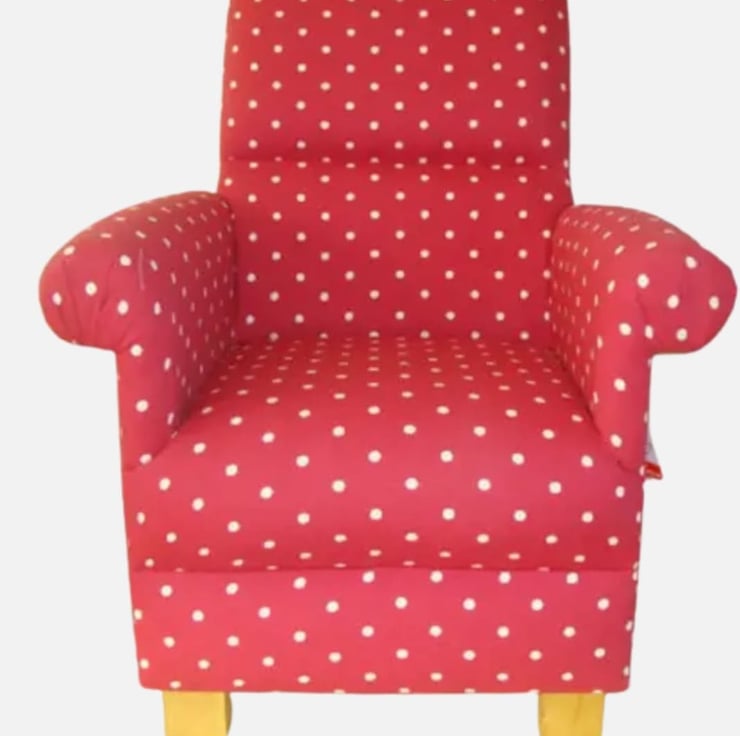 I am offering for sale this gorgeous ADULT'S chair, which has been made myself. I am a professional upholsterer with over 33 year’s experience, and have made this sturdy little chair using Clarke & Clarke Red Dotty Spot fabric.