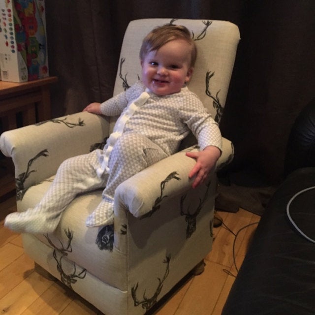 I am offering for sale, this beautiful, handcrafted child's chair, which has been made by a professional upholsterer with 32 years experience, using Clarke & Clarke Pastel Elephants fabric.