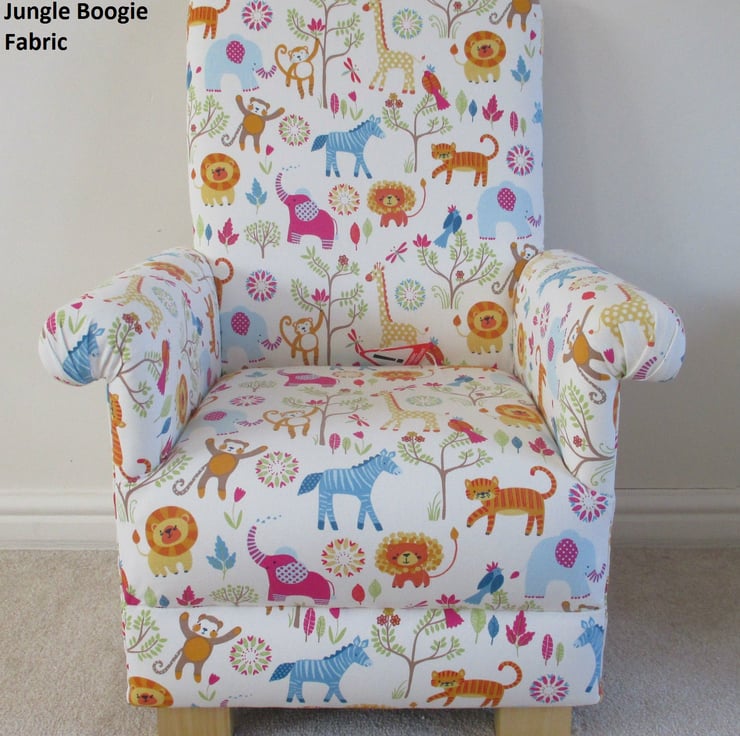I am offering for sale this gorgeous handcrafted child's chair which has been made by myself, a professional upholsterer with 32 years experience, using Prestigious Jungle Boogie fabric.