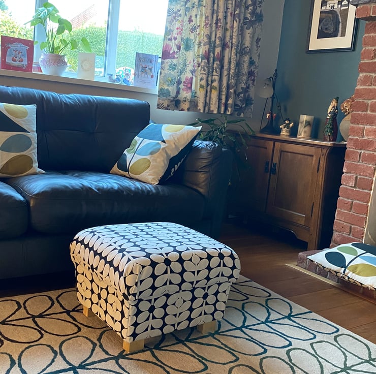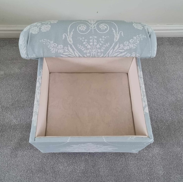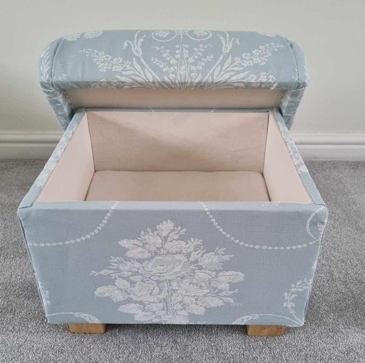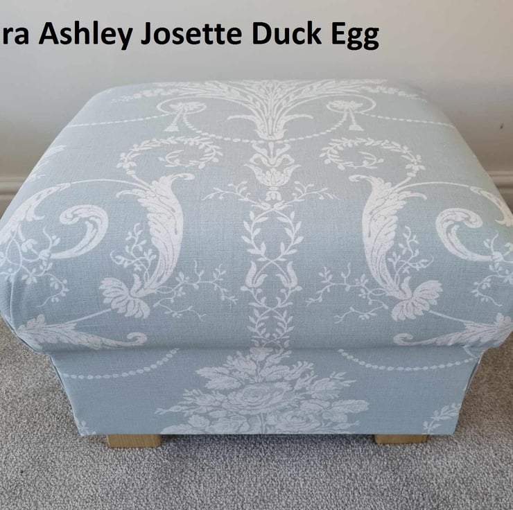 I am a professional upholsterer with over 33 years experience, and have handmade this adult sized footstool using Laura Ashley Josette fabric in Duck Egg.
