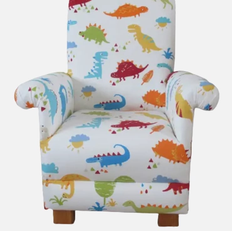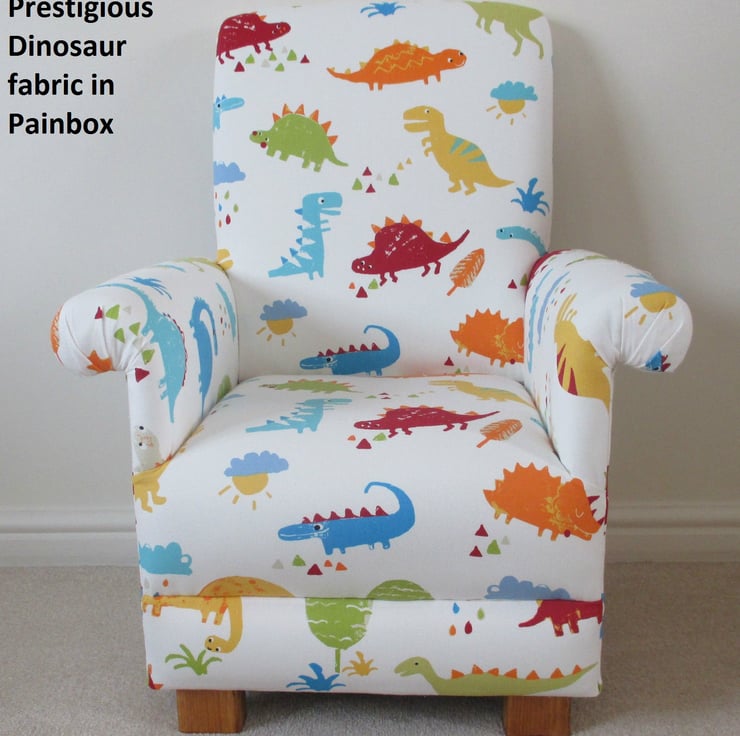 I am a professional upholsterer with over 33 years experience, and have made this sturdy little CHILD’S chair, using Prestigious Dino fabric in Paintbox colourway.