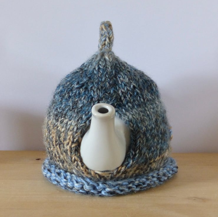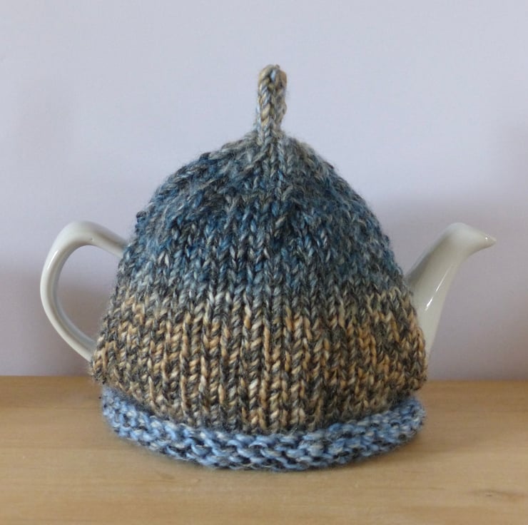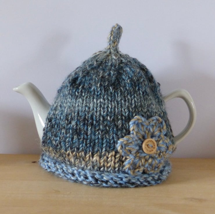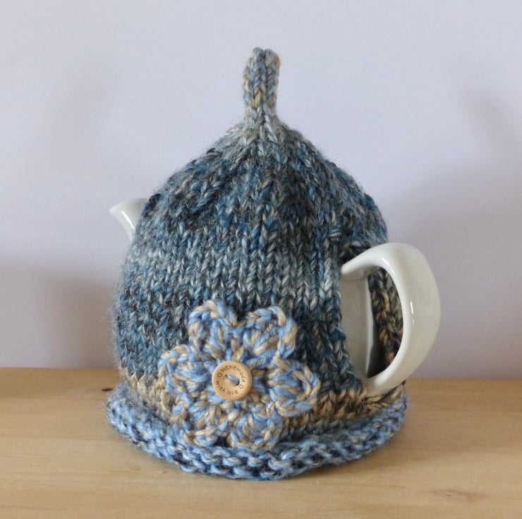 A hand knitted Tea Cosy in a chunky variegated yarn in shades of Blue, Grey and Beige. It has a 'pixie' top and a crocheted flower, in the same yarn as the cosy, on the front for decoration. The flower has a small wooden button in the centre with the words 'Handmade With Love' printed on it.