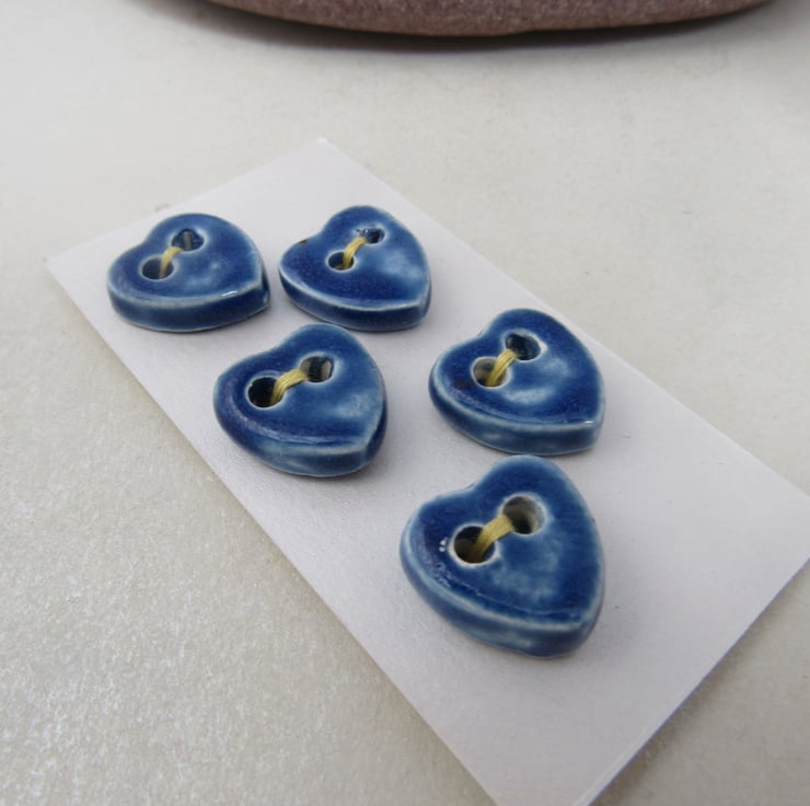 5 small stoneware heart buttons finished with a glossy ice blue glaze.