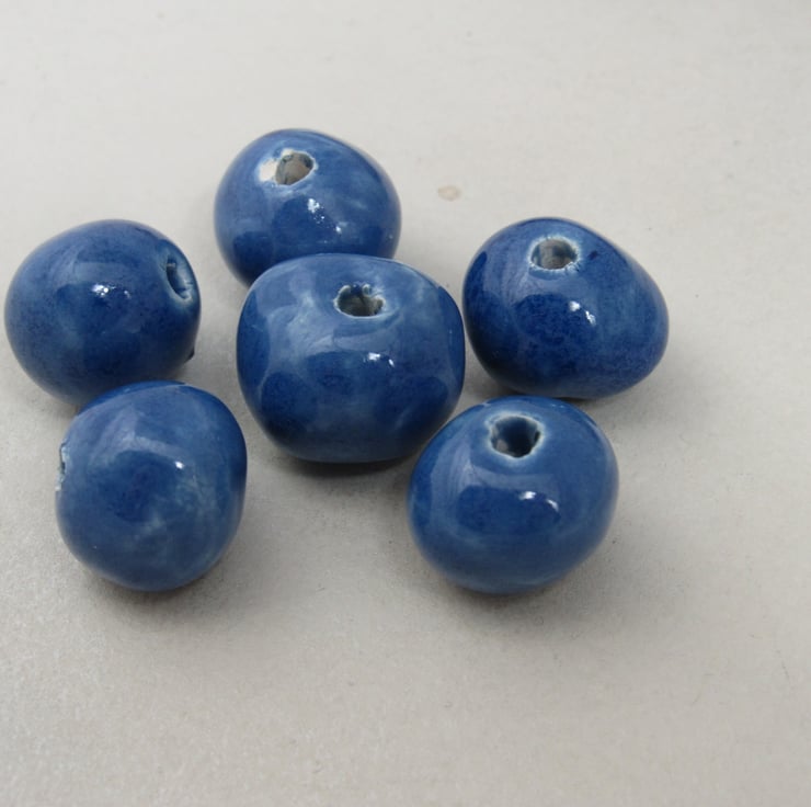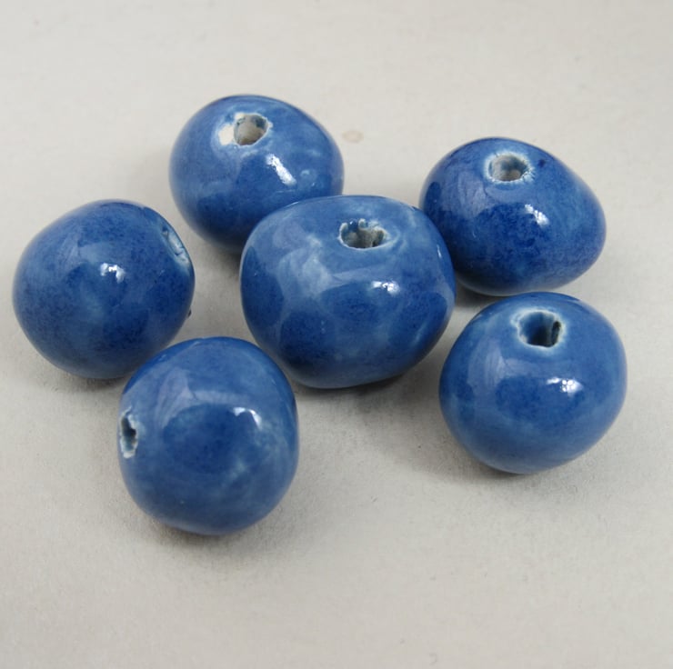 A mixture of handrolled ceramic beads, finished with a gloss ice blue glaze.