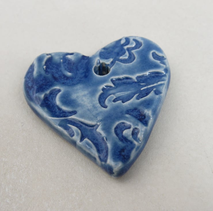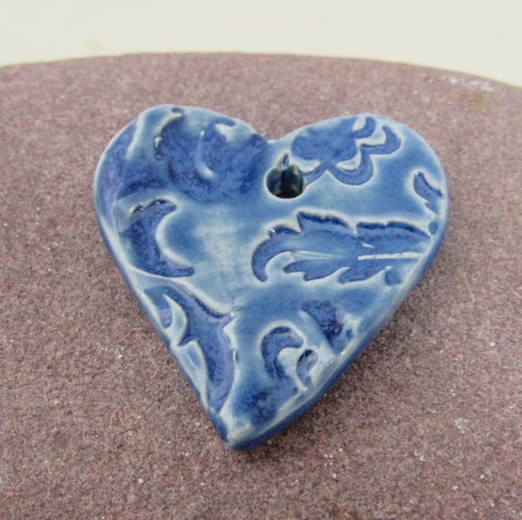 Medium heart shaped stoneware pendant, textured with a bold leaf and flower motif.