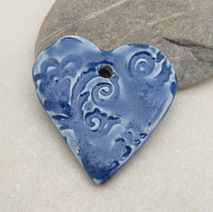 Medium Ice Blue Brocade Texture Heart Shaped Ceramic Pendant